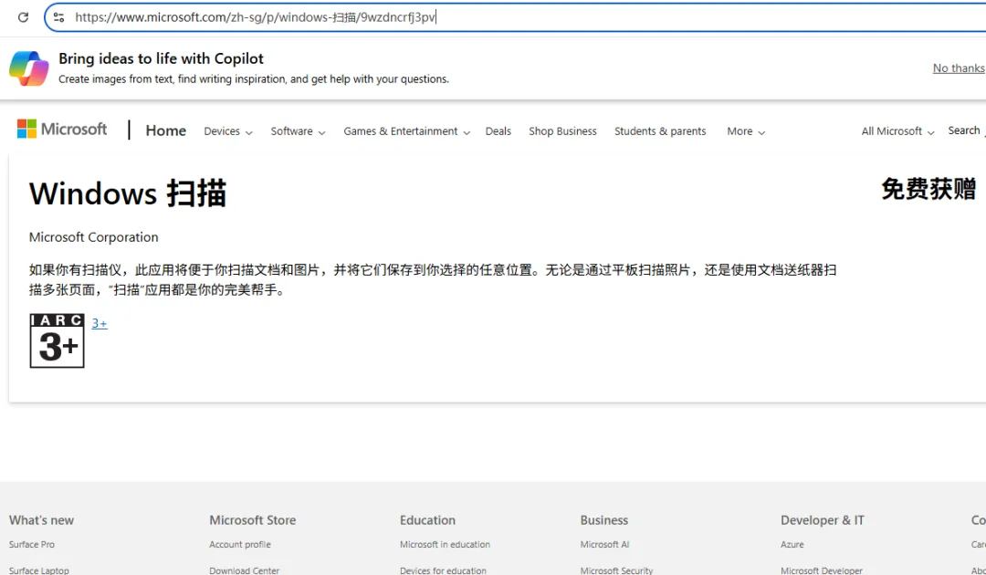 搜索软件应用找到商店地址https://www.microsoft.com/zh-sg/p/windows-%E6%89%AB%E6%8F%8F/9wzdncrfj3pv