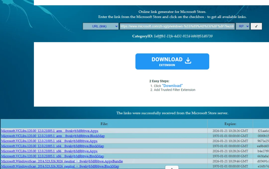 接下来,把找到的商店链接输入到链接转换网站中,点击“对号”后,逐项列出直接下载链接,有些是依赖包、运行库、有些是软件安装包。