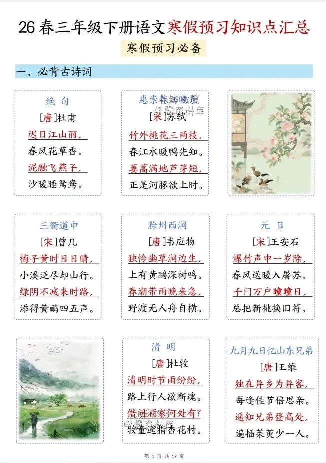 今天给大家整理了26春三年级下册语文寒假预习知识点汇总(完整版),转发给朋友或班级群,受益更多人,帮助孩子学习!