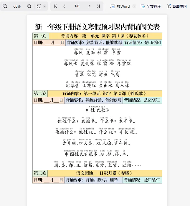 >一年级(下)语文 课内背诵闯关表,免费下载