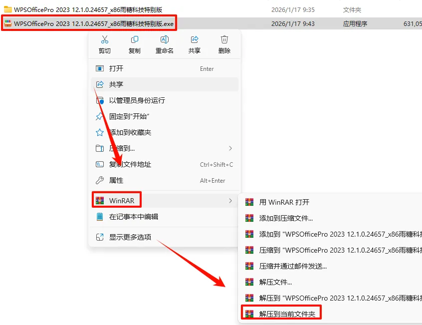 2.打开刚刚解压的文件夹,鼠标右键点击“WPSOffice_RCTSE_2023_12.1.0.24657_x86_20260115_雨糖科技.exe”选择“以管理员身份运行”