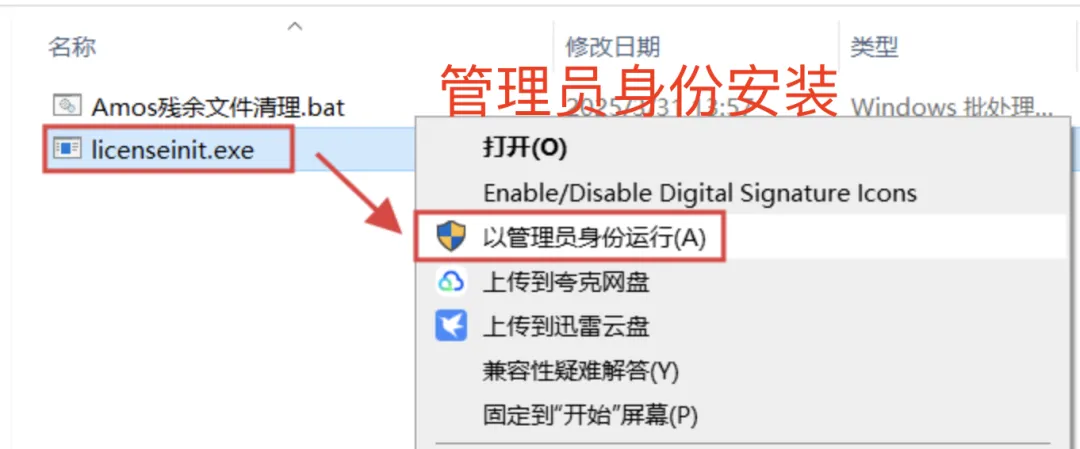 4、继续选中同一文件夹内的:licenseinit 程序,右键选择:以管理员身份运行。