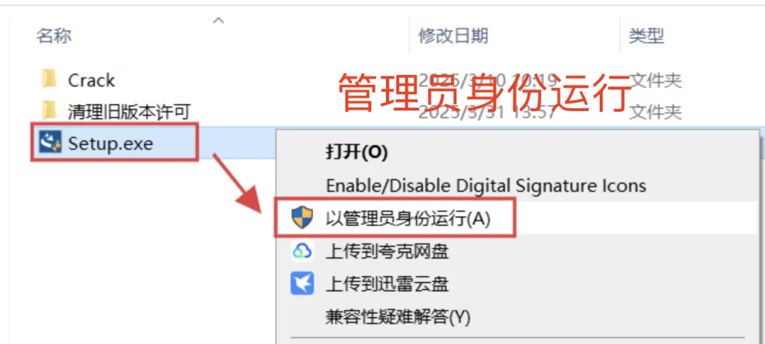 1、返回解压的主文件夹,选中 Setup 程序,右键选择:以管理员身份运行。