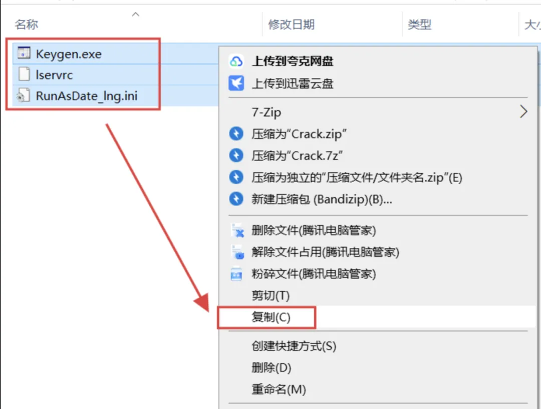 1、返回解压文件夹,双击打开文件:Crack,选中文件夹内所有文件,右键:复制。