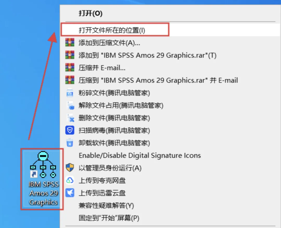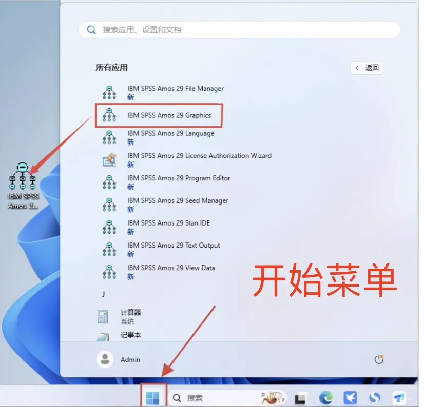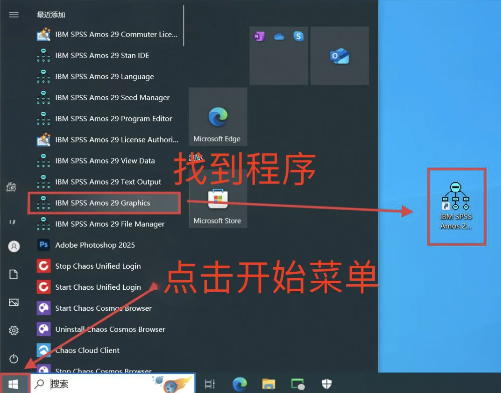 Win10系统:点击开始菜单,找到并展开【IBM SPSS Amos】文件夹,将【IBM SPSS Amos 29 Graphics】图标拖拽到桌面。