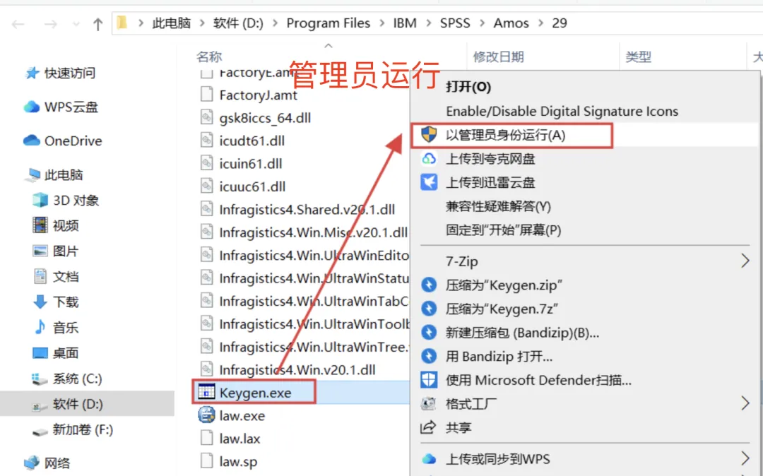 4、在此文件夹中,找到并右键点击粘贴过来的【Keygen】程序,选择【以管理员身份运行】。