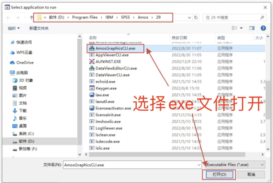 6、导航至您在第12步设置的安装路径(例如 D:\Program Files\IBM\SPSS\Amos\29),选中其中的【Amos GraphicsCLI】程序文件,点击【打开】。