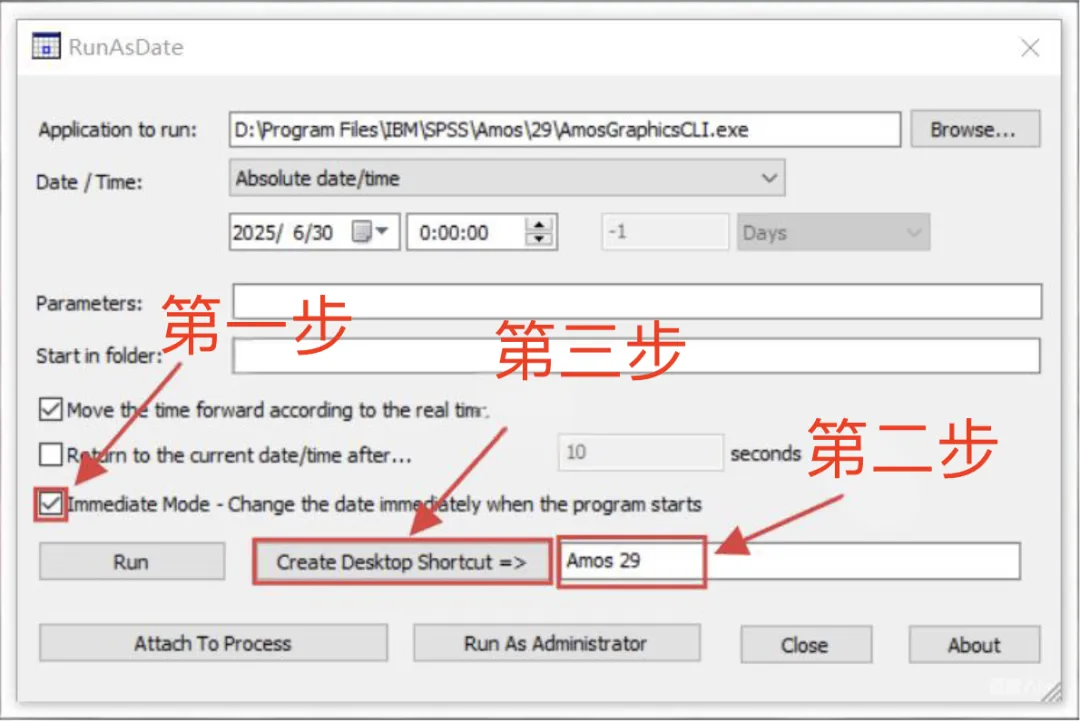 7、回到Keygen窗口,先勾选【Immediaate Mode...】,然后在下方输入框内输入【Amos 29】,最后点击【Create Desktop Shortcut=>】。这将在桌面生成一个最终的启动快捷方式。