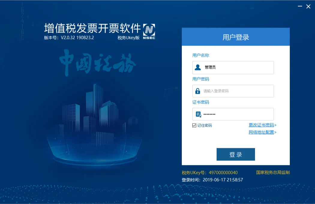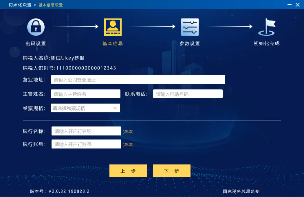 3.用户在初次安装使用开票软件,或者首次在本机使用税务UKey开票时,需要进行系统注册,注册用户基本信息。注册内容包括管理员密码、企业基本信息、网络配置参数等。