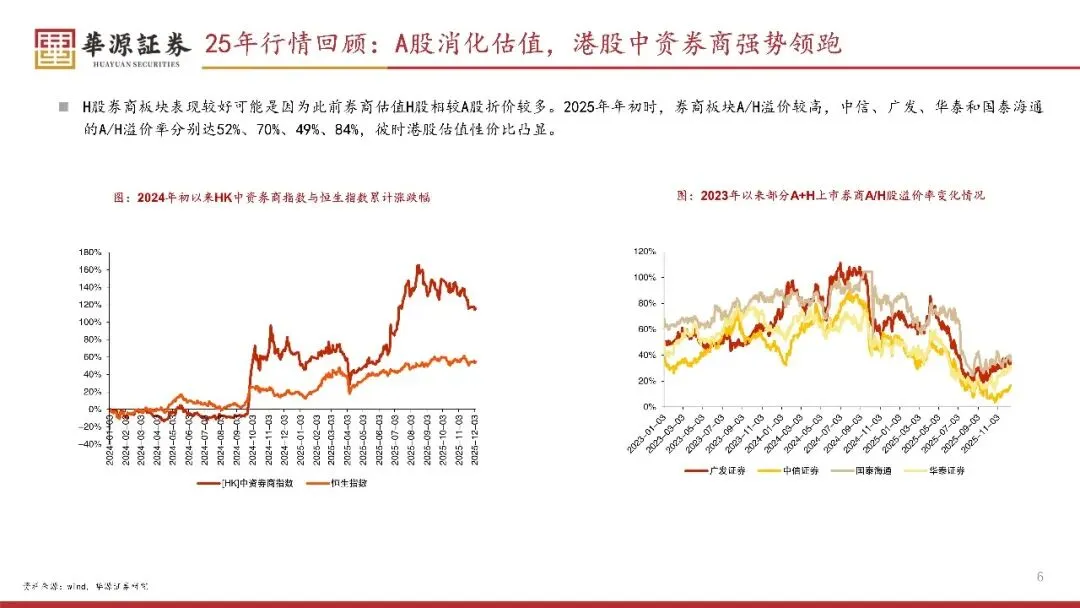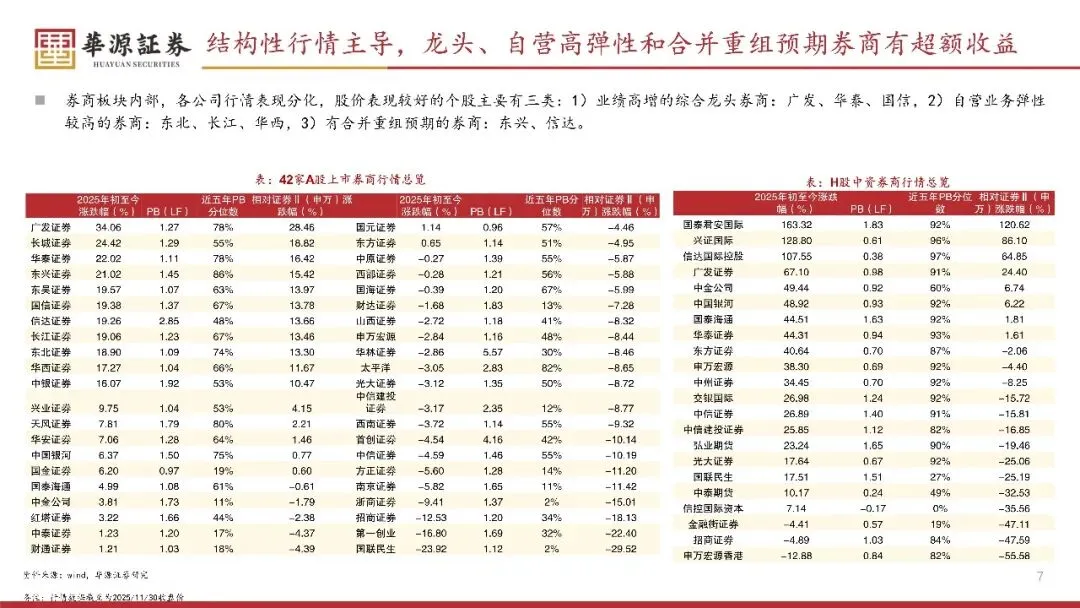 2025年初至11月28日,证券|(申万)指数累计涨幅为5.6%,跑轮输沪深300;香港中资券商指数累计涨幅42.7%,跑赢恒生指数10. 9pctAH股行情出现分化,A股券商板块行情较弱或由24年涨幅较高仍需消化估值、养商内部业绩有分化双重因素所致,卷商TH股行情强势或主要由AH溢价收敛等因素所致。