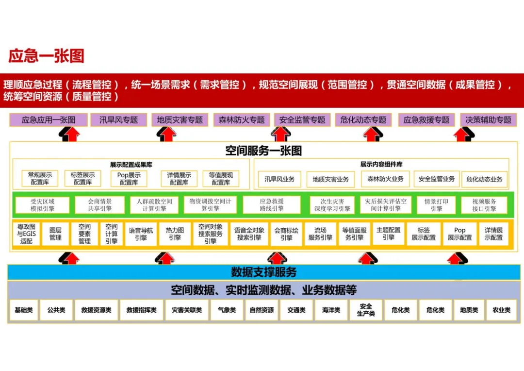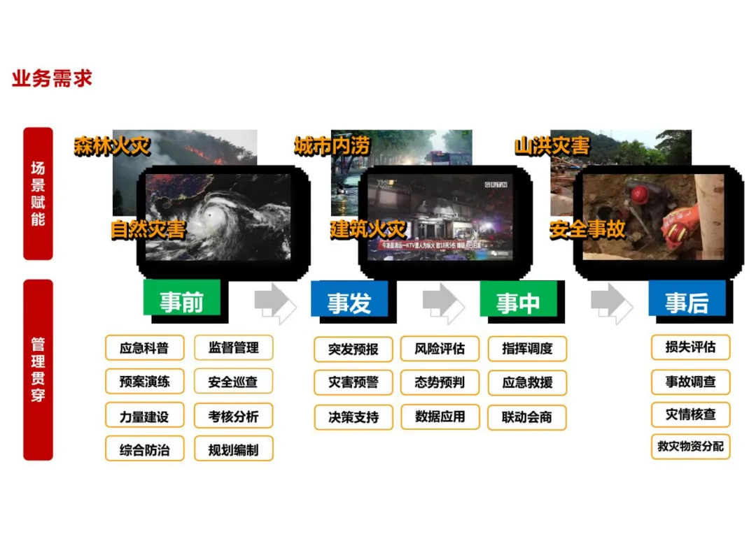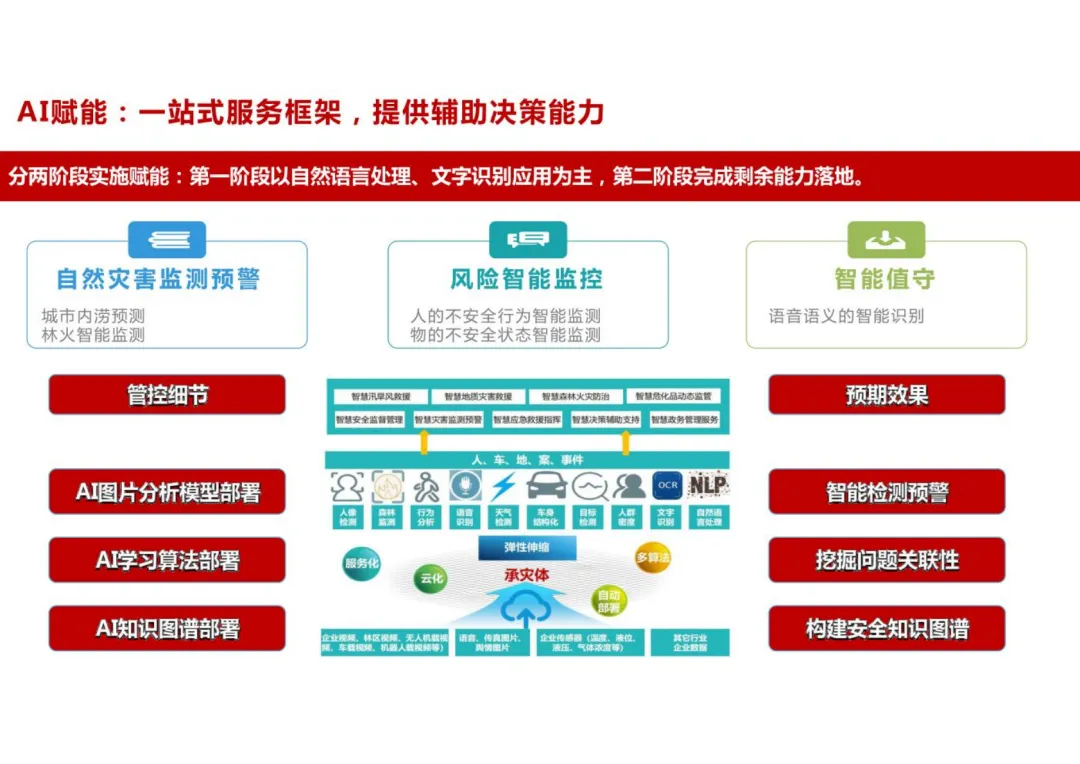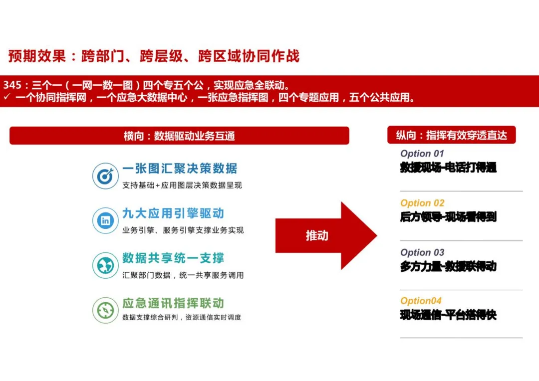 在“四纵四横”架构之上,具体的智慧应急解决方案致力于实现显著的赋能效果,核心可概括为“三个一”:
