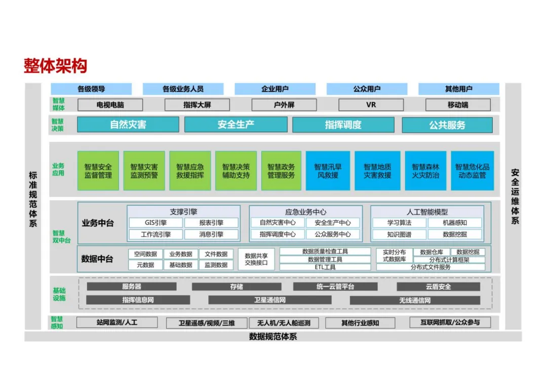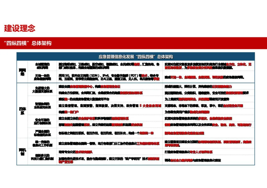 为了实现应急管理的智能化、协同化目标,一套被业界广泛认可的“四纵四横”总体架构提供了清晰的实施蓝图。这是一个覆盖技术、业务、管理与标准的立体化支撑框架。