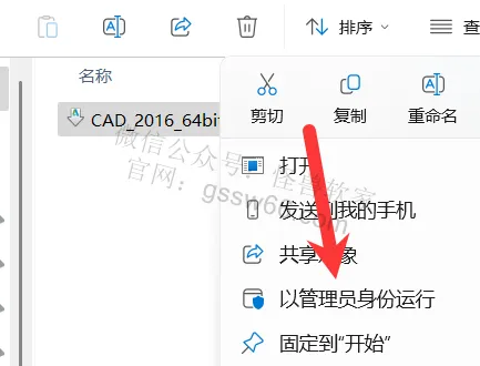 04,找到并选中“CAD_2016_64bit.exe”安装程序,点击鼠标右键,点击“以管理员身份运行”
