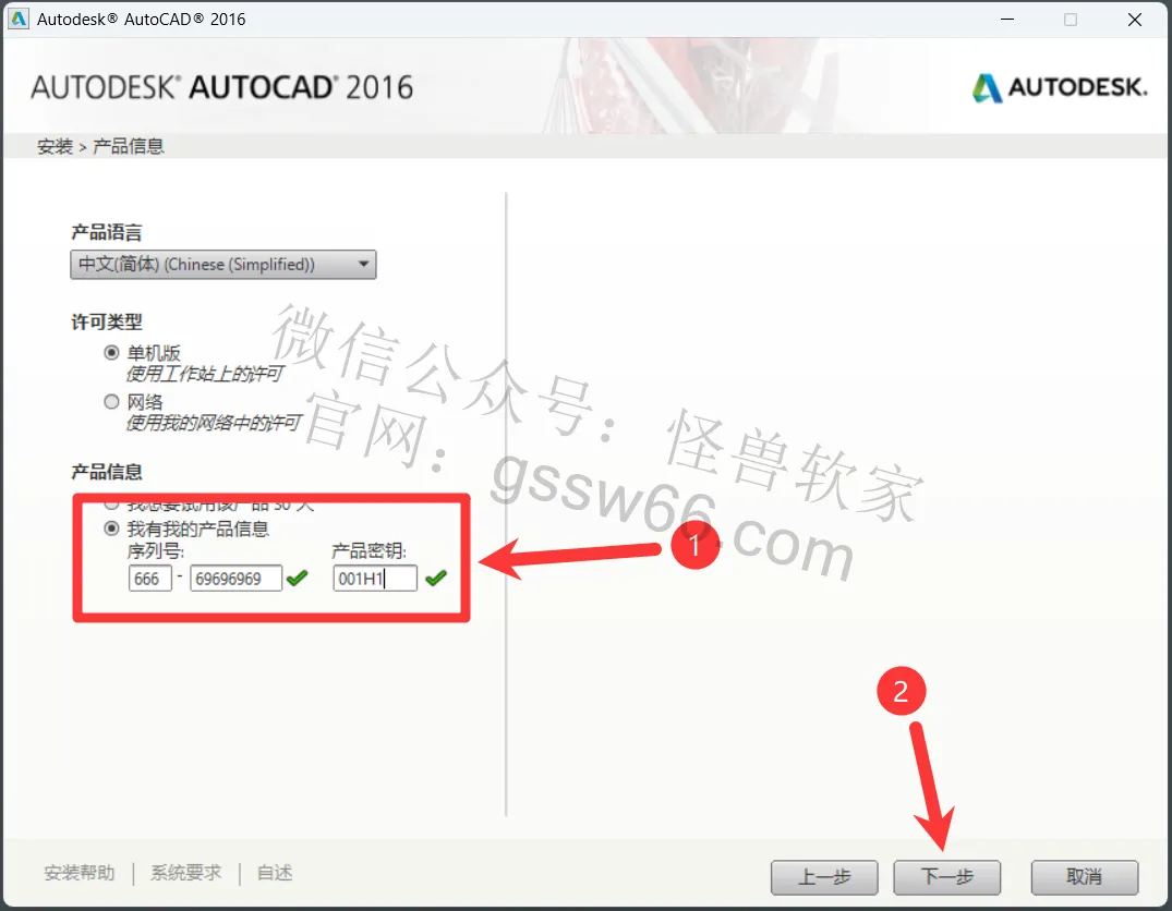 10,输入序列号“666-69696969”,产品密钥“001H1”,点击“下一步”