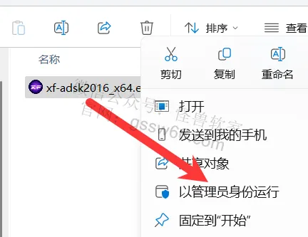 23,找到并选中“xf-adsk2016_x64.exe”程序,点击鼠标右键,点击“以管理员身份运行”