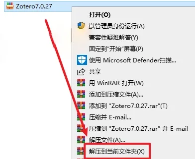2.打开解压出来的文件夹,选中 【Zotero-7.0.27_x64_setup】程序,鼠标右键选择【以管理员身份运行】。
