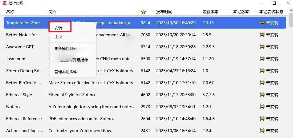 5.选中需要安装的插件,例如选择【translate-for-zotero】翻译插件,鼠标右键选择【安装】等待安装完成即可。