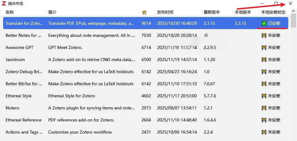 6.右边显示绿色【已安装】,代表插件安装完成,点击右上角【X】关闭。