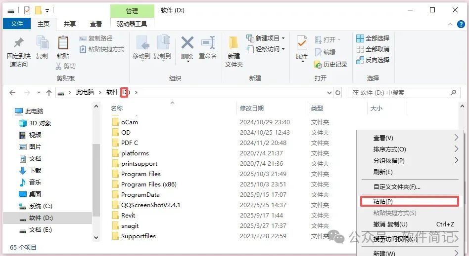 3.打开您需要将软件存放的磁盘(如:D盘)鼠标右击空白处选择【粘贴】。