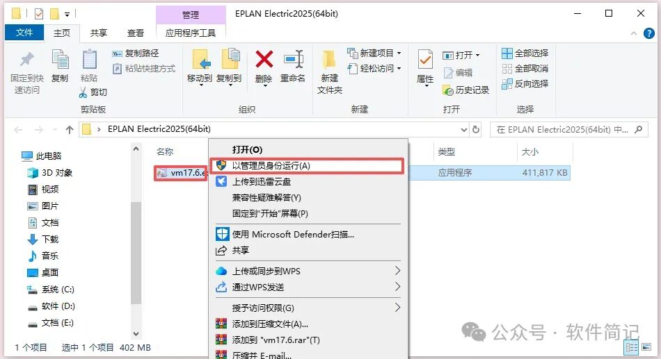 4.打开安装包解压后的【EPLAN Electric2025(64bit)】文件夹,鼠标右击【vm17.6】选择【以管理员身份运行】。