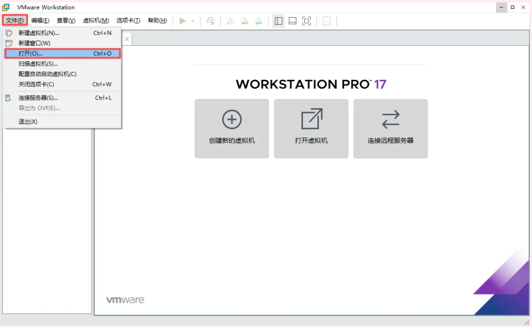 16.在"VM"虚拟机打开的界面中,点击【文件】,点击【打开】。