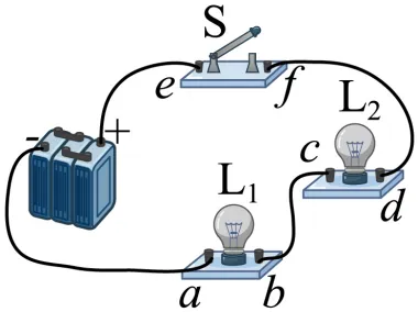 4. 如图所示是丁丁同学做串联电路实验的实物电路,闭合开关S后,小灯泡L1、L2都不亮.为了检查故障,丁丁用一段导线的两端接触a、b两点时,两灯仍不亮;接触c、d两点时,两灯还不亮;接触e、f两点时,两灯都亮了.则下列对电路故障判断正确的是()
