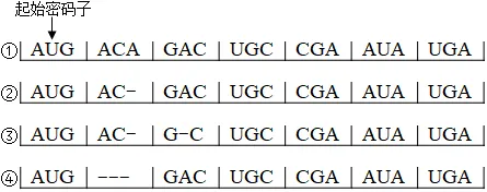 15. 终止密码子为UGA、UAA和UAG。图中①为大肠杆菌的一段mRNA序列,②~④为该mRNA序列发生碱基缺失的不同情况(“-”表示一个碱基缺失)。下列有关叙述正确的是()
