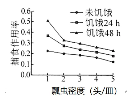 18. 农业生产中常利用瓢虫来防治叶螨。某小组研究瓢虫的饥饿程度和密度对其捕食作用率的影响,结果如图所示。下列有关叙述错误的是()