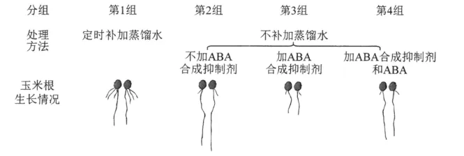 19. 某课题组为了研究脱落酸(ABA)在植物抗旱中的作用,将刚萌发的玉米种子分成4组进行处理,一段时间后观察主根长度和侧根数量,实验处理方法及结果如图所示。