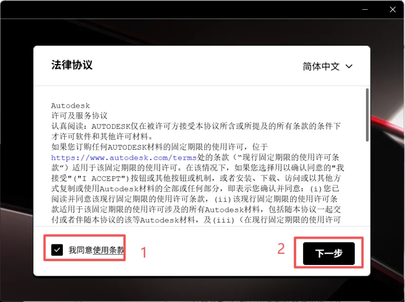 5.点击【我同意使用条款】,然后进行下一步。