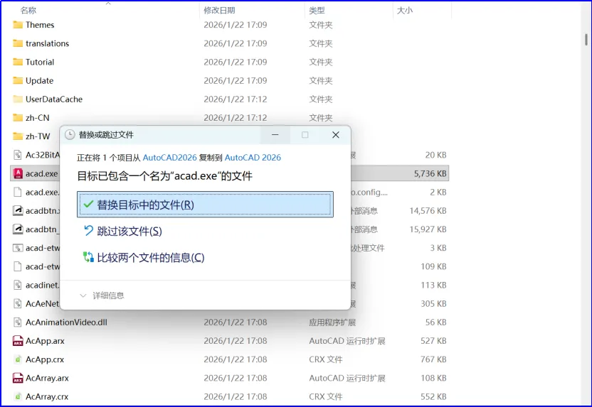 11.在第9步的文件夹中右键,选择【粘贴】或者按ctrl+V,并选择 【替换目标中的文件】,至此CAD2026就安装并破解完成。