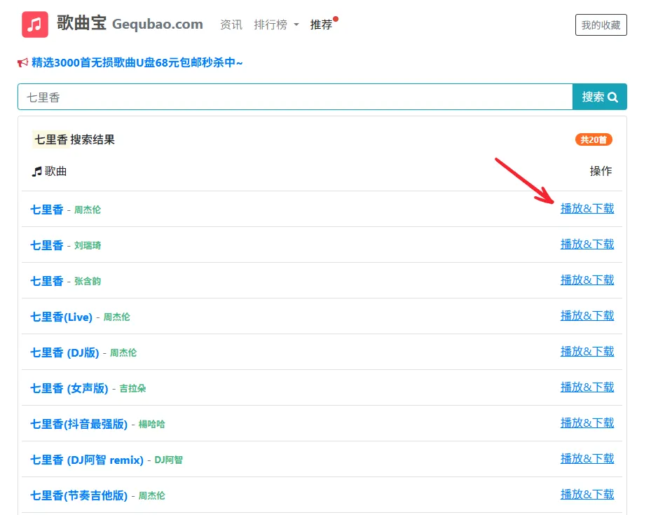 搜索结果列表中给了很多版本,我们选择想要的歌手的版本,点击【播放&下载】。