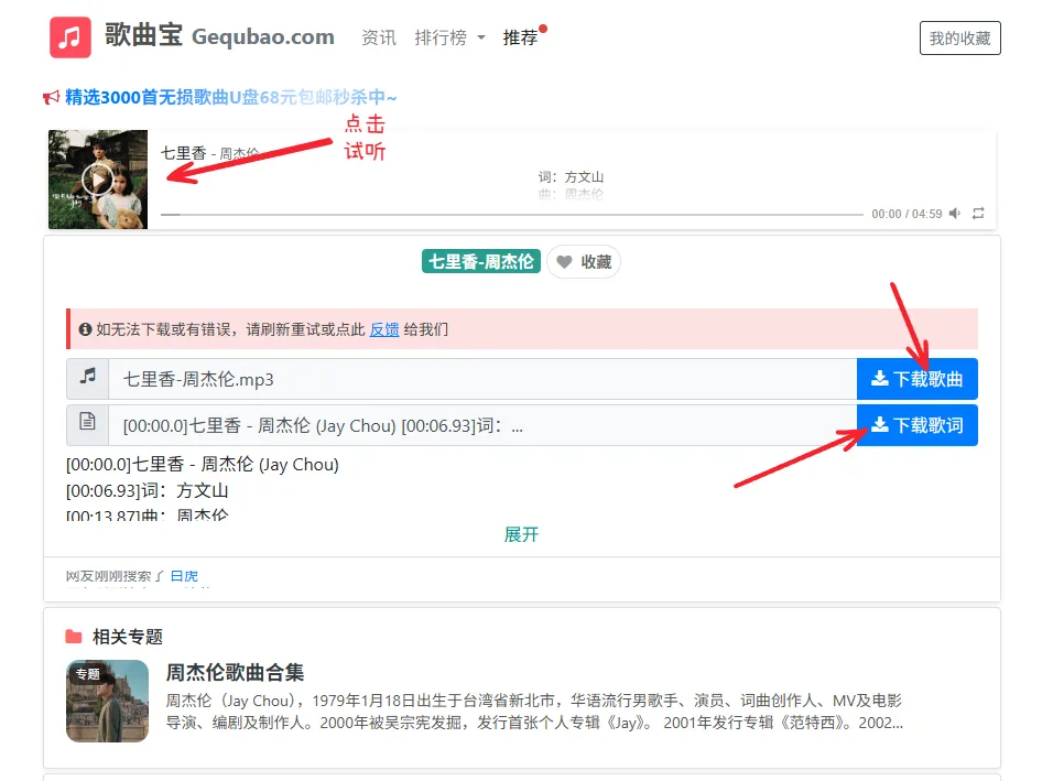 然后就可以试听、下载歌曲或者下载歌词了。