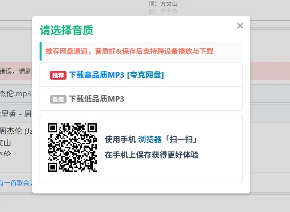 点击下载歌曲。这里给出两种下载方式:夸克网盘或者直接下载,不同的是,夸克网盘可以下载高品质MP3文件,而直接下载的是低品质MP3。
