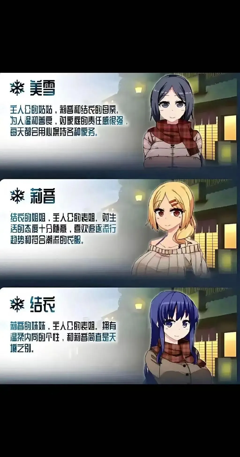 剧情内容故事发生在前作半年后的寒假,主角结束城市的学期生活后,再次前往乡下姑姑家度假。玩家会与前作中熟悉的美雪姑姑、时尚随性的莉音表姐、文静内向的结衣表姐重逢,同时还能邂逅灯里、凉花、镜等新角色。剧情围绕主角在冬日小镇的日常展开,通过与不同角色的互动,既能体验温馨的家庭琐事,还能挖掘每个角色背后的小秘密,不同的互动选择会让故事走向不同方向。