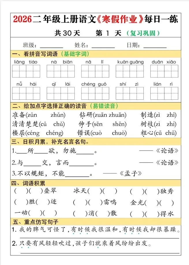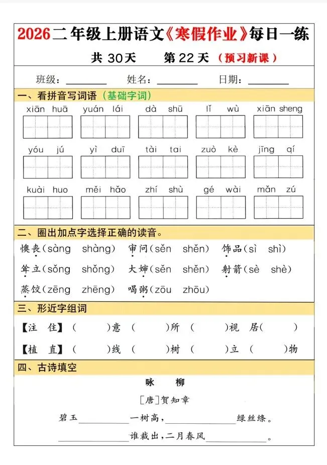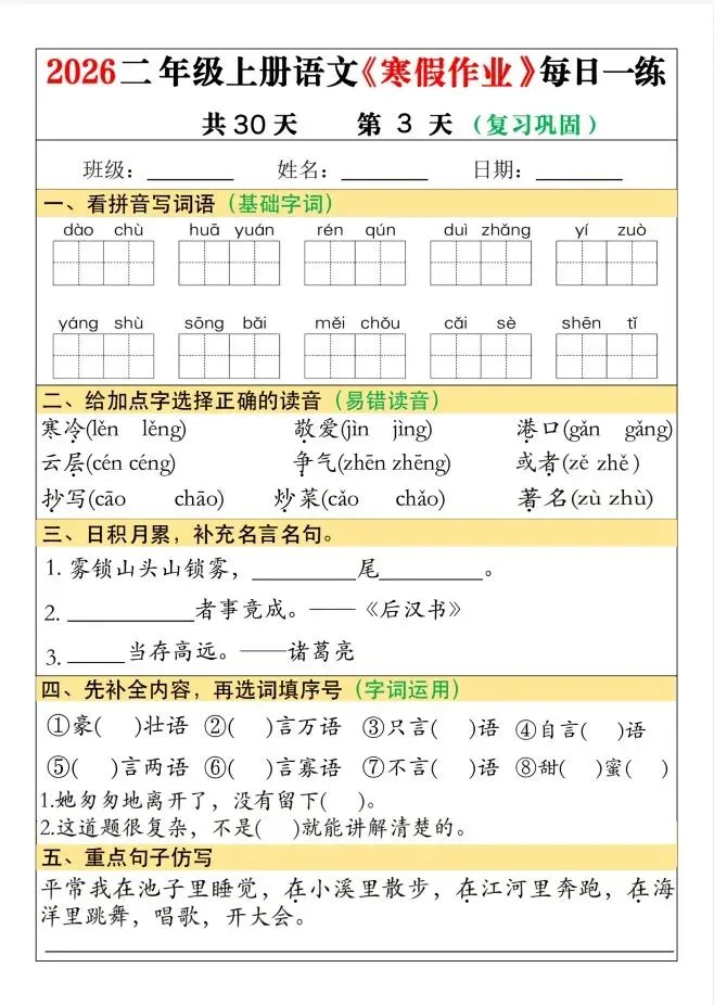 今天给大家整理了26春二年级语文寒假作业每日一练30天(巩固+预习),转发给朋友或班级群,受益更多人,帮助孩子学习!