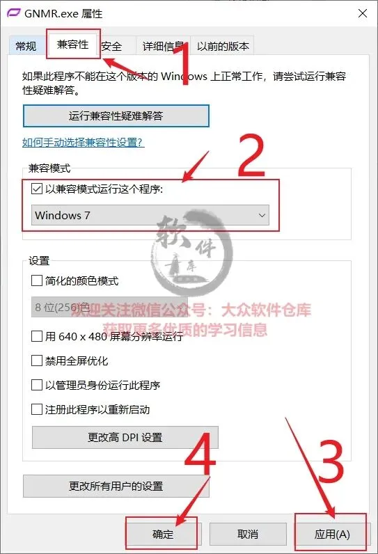 4.在兼容性那里改为以windows 7兼容模式运行,点击应用,点击确定;