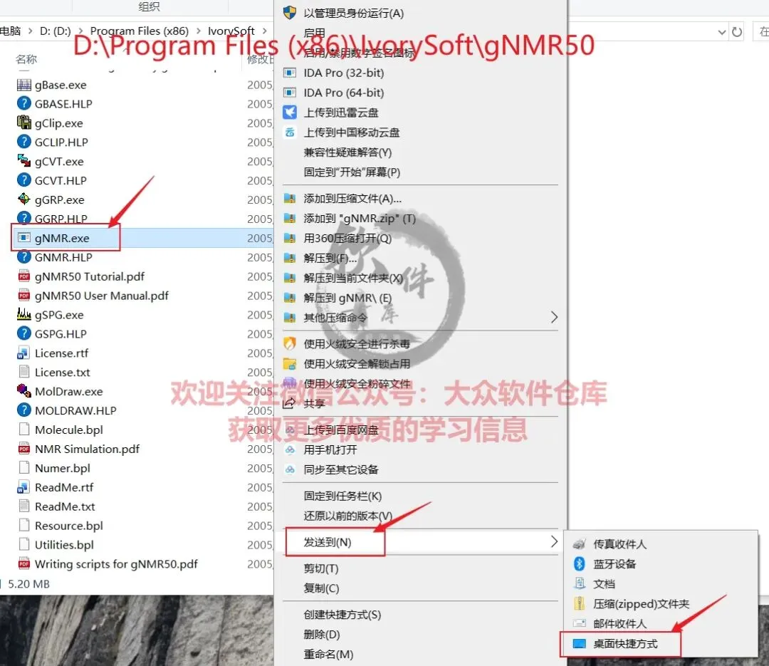 18.打开安装目录:D:\Program Files (x86)\IvorySoft\gNMR50。将gNMR.exe程序发送到桌面快捷方式;