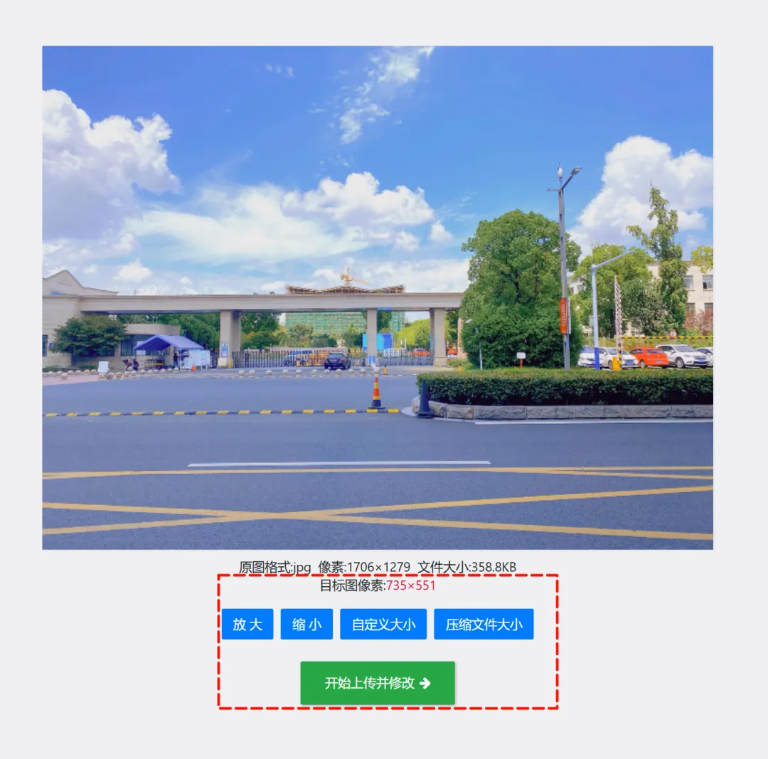 只需要上传需要修改的图片,然后点放大和缩小,或者选择你自己需要的大小,调整到想要的尺寸之后点开始上传并修改即可。