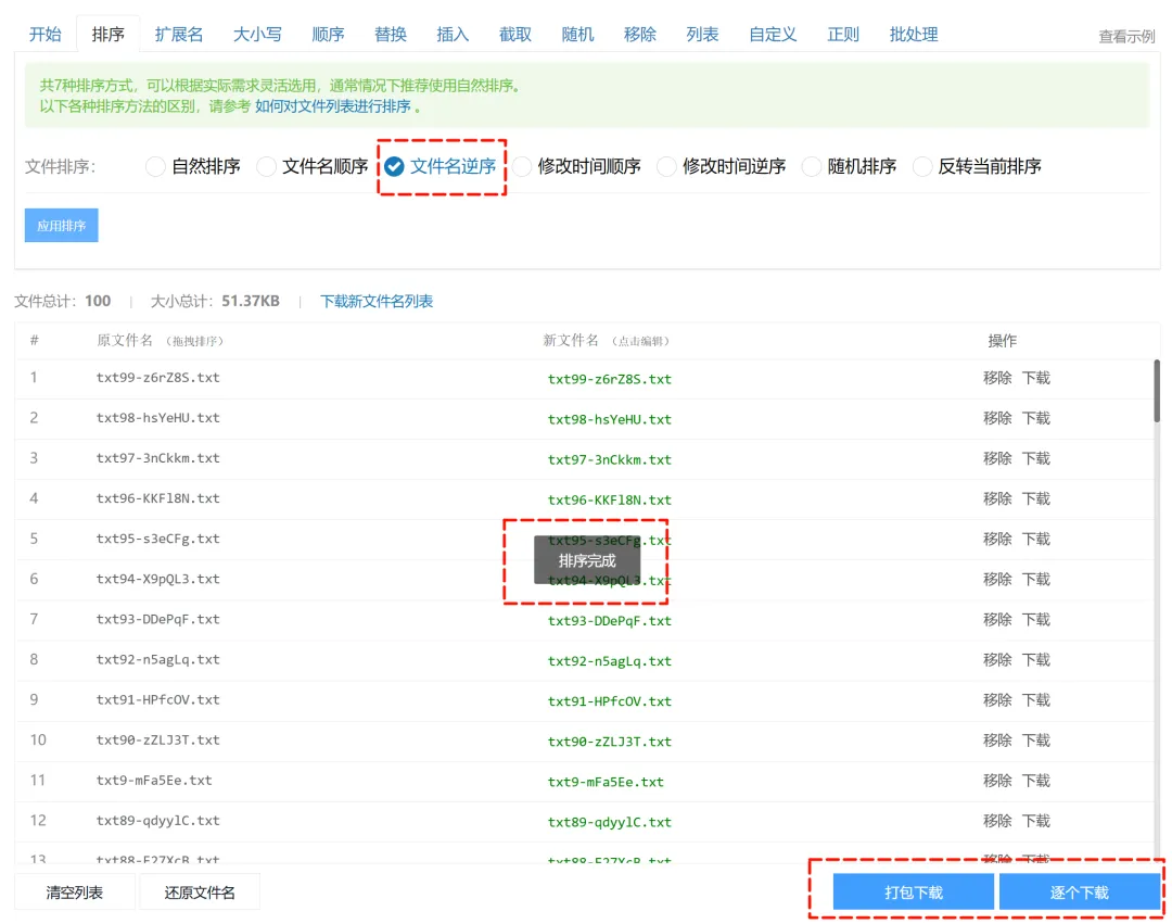 比如你可以在这里给文件名进行排序显示,排序完成之后可以打包下载,也可以逐个下载,非常的方便。