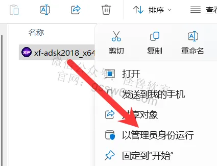 22,找到并选中“xf-adsk2018_x64.exe”程序,点击鼠标右键,点击“以管理员身份运行”