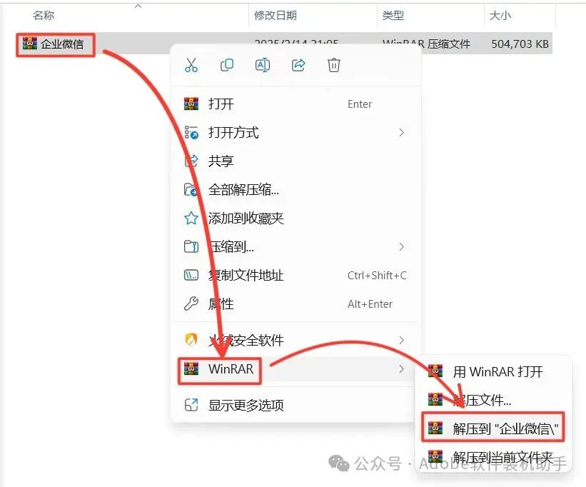 1.打开下载的企业微信安装包,鼠标右击压缩包选择【解压到 企业微信\】。