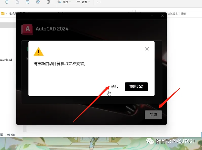 6、安装完成后,出现重启计算机选项,点击稍后,然后点击完成;