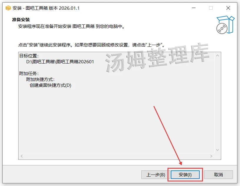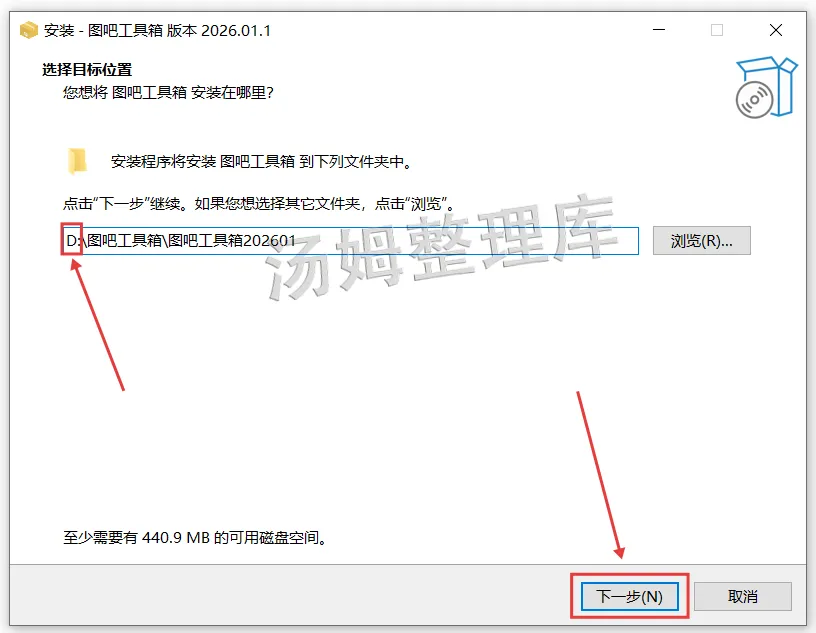 2.打开解压的文件夹,双击【图吧工具箱202601.1安装包.exe】程序运行安装。3.自行选择安装路径:也可以将路径地址中的首字符C改为D,软件就会安装到D盘,选择好点击【下一步】。