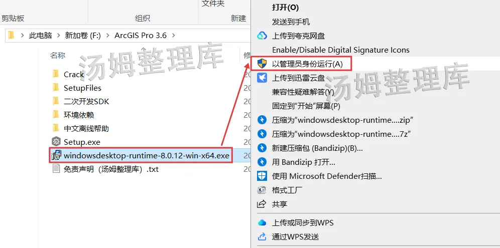 2.打开解压的文件夹,选中【windowsdesktop-runtime-8.0.12-win-x64.exe】右键选择【以管理员身份运行】。(如果系统安装过【windowsdesktop-runtime-8.0.12】运行组件,直接跳到第5步即可,没有安装过ArcGIS Pro软件的同学,可以把【环境依赖】里的安装文件也安装一下)