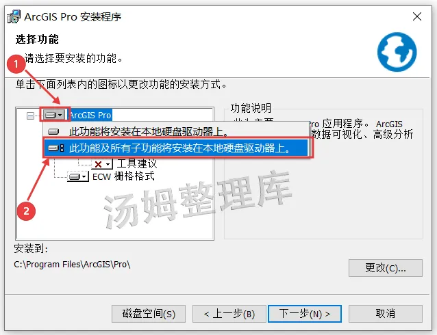10.先点击【三角形展开符】,然后选择【此功能及所有子功能将安装到本地硬盘驱动器上】。