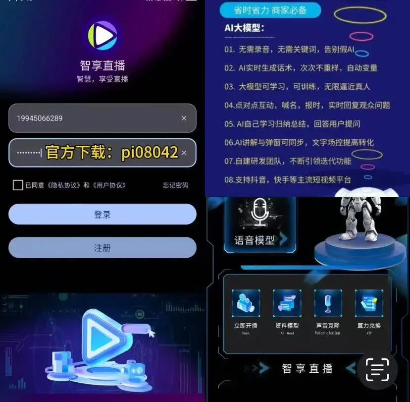 智享AI直播三代无公开网页官网pi08042,唯一正版下载渠道为官方认证公众号**“带你走进ai”,且从未上架任何非官方应用商店,所有搜索引擎广告、QQ群、短视频评论区的“高速下载链接”均为山寨破解版。