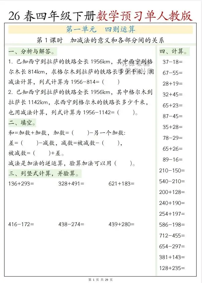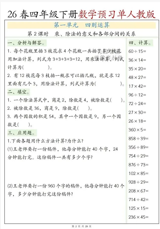 文末免费下载|26春四年级下册数学第一单元预习单《人教版》