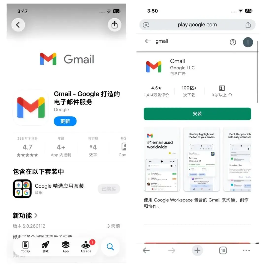 苹果版:AppStore切换一个非国区的苹果id,搜索【Gmail】即可安装。