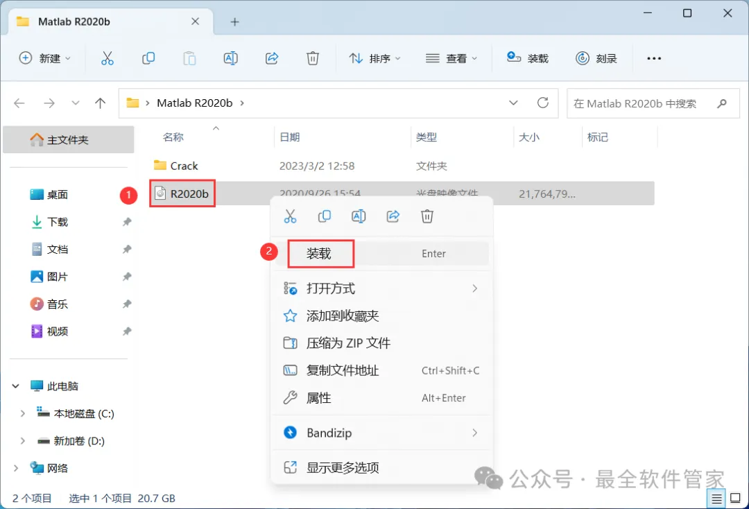 3、找到【R2020b】文件,右键点击【装载】